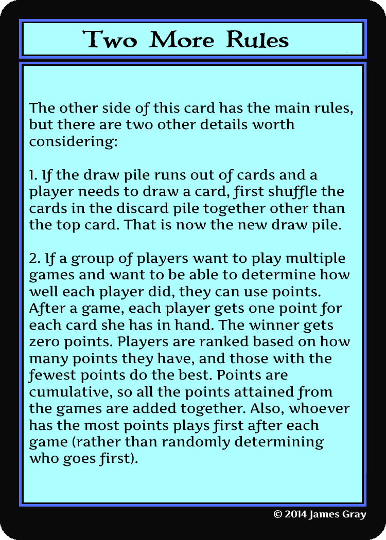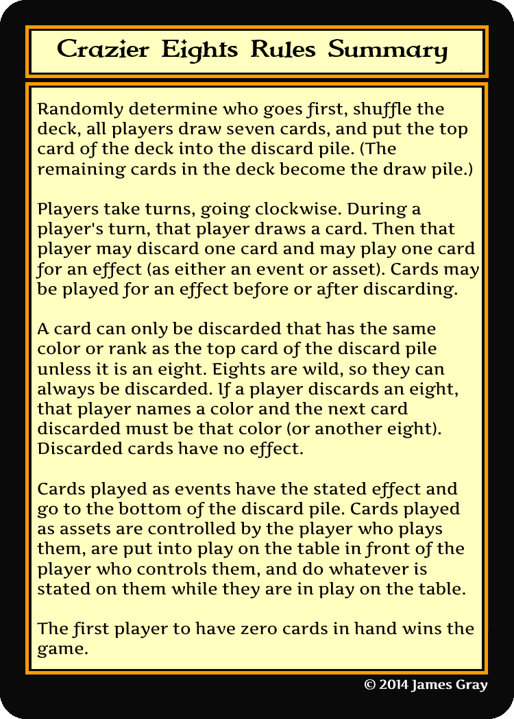 One card that has always fascinated me found in many poker decks is the rules card, so I like to make them for my own games. The current abridged rules cards for Crazier Eights are the following. Click on an image to see a larger version.