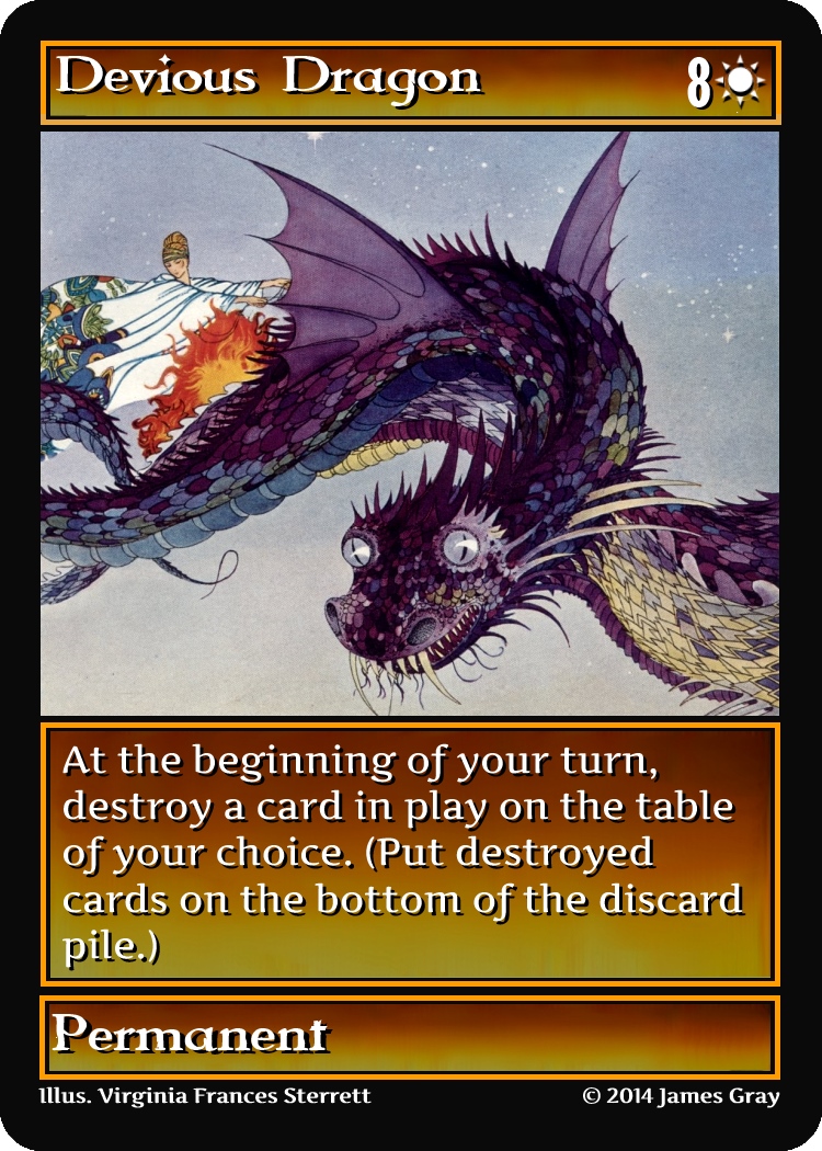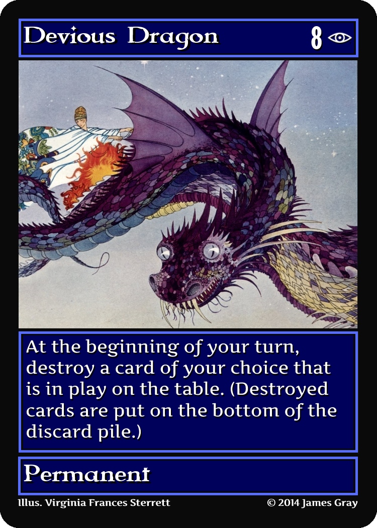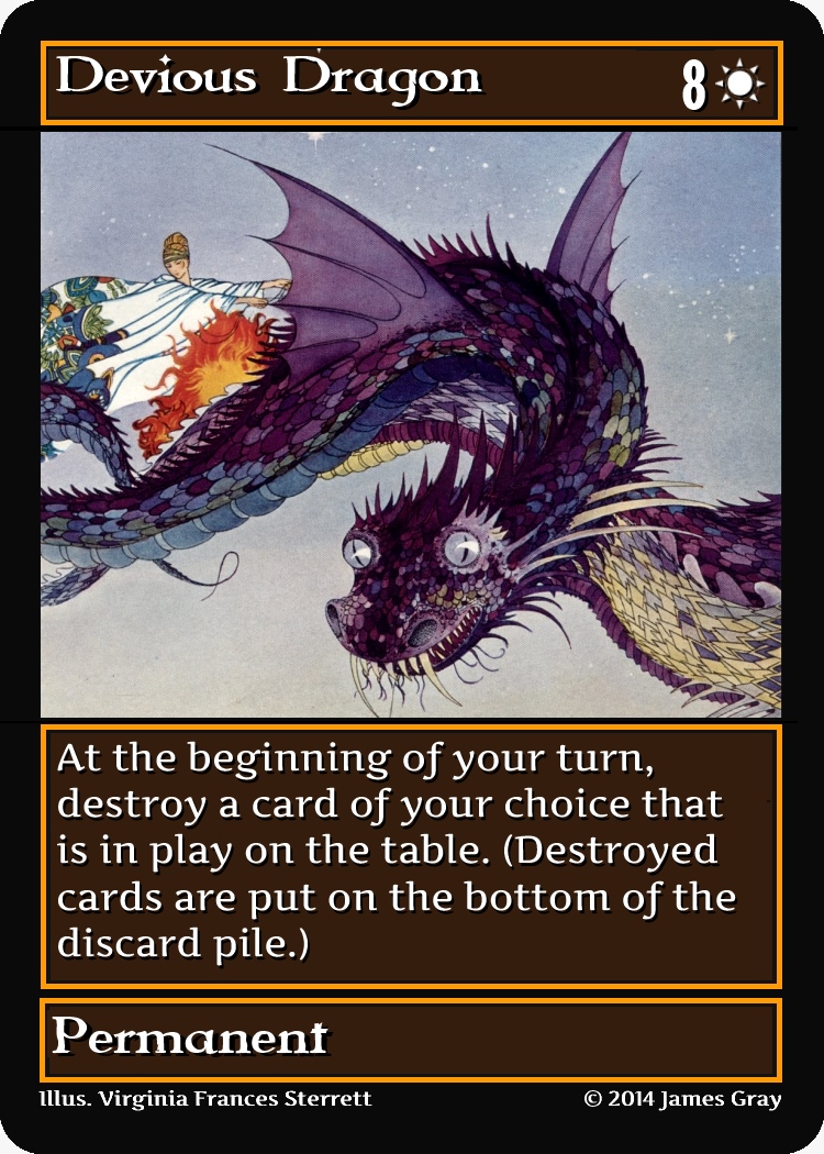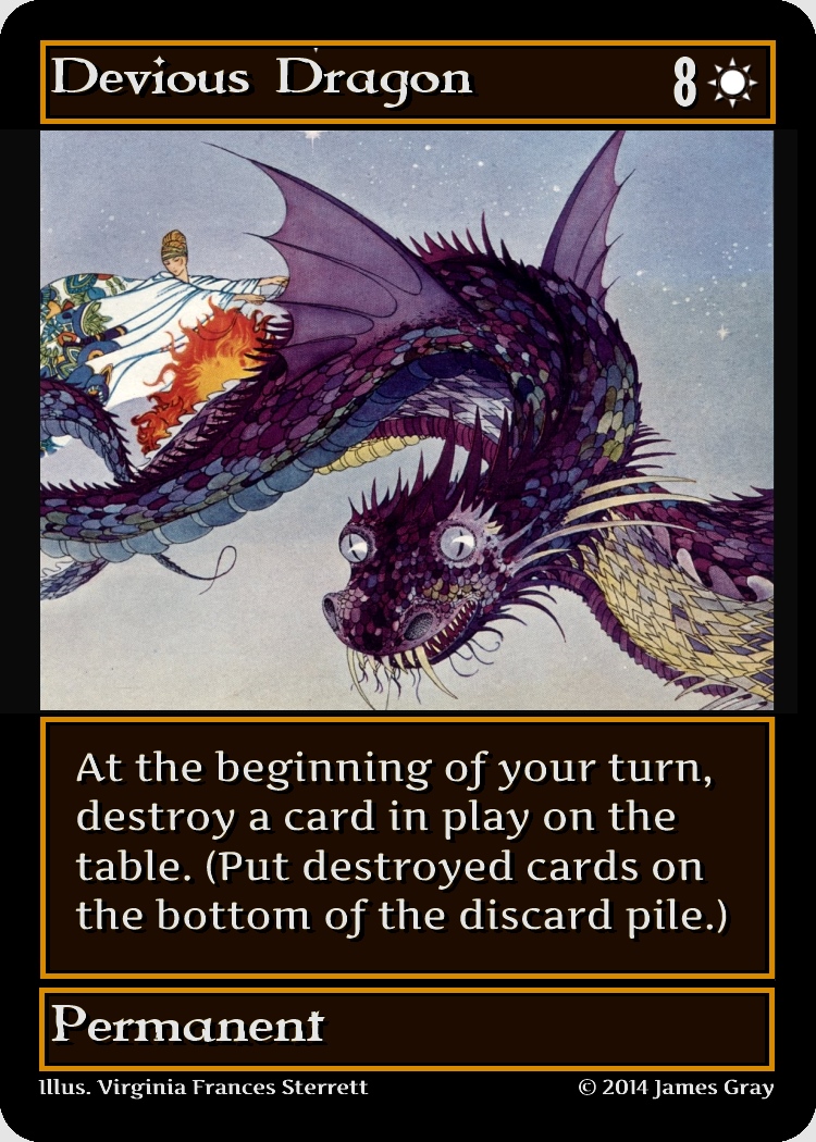 1. Why does (2) have different templating? It seems simpler to me. Although you could remove the term ‘destroy’ altogether (which gets rid of the need for reminder text). ‘At the beginning of your turn, you must choose put a card in play on the bottom of the discard pile’