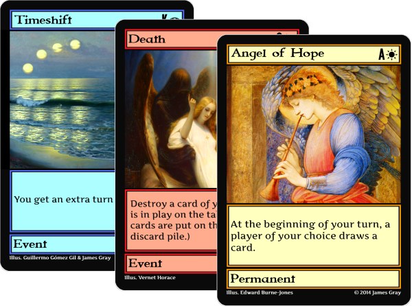 I decided to use somewhat wordy templating in the hopes that it will make things more clear. For example, Forbidden Knowledge states, “A player of your choice draws three cards.” I considered having the card say, “A player draws three cards” or “Target player draws three cards.”