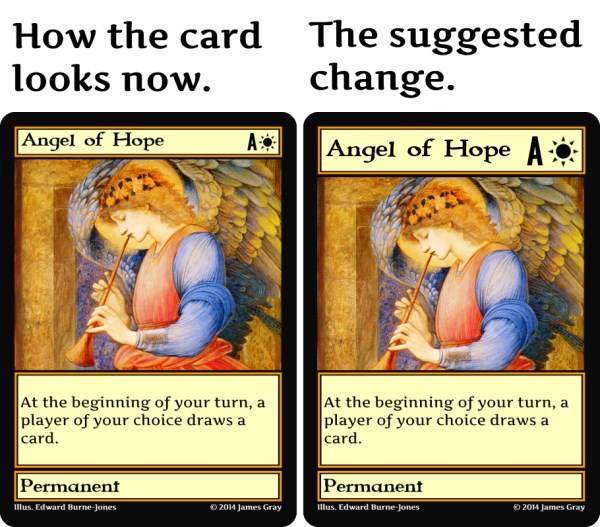 There are three reasons that I would prefer not to change the card frame other than the fact that I feel like they are okay as they are currently. One, it would take some work to change all the cards in these ways. Two, I have already been promoting the game using the current templates. Three, anyone who prefers the current templates would be disappointed if they were changed.