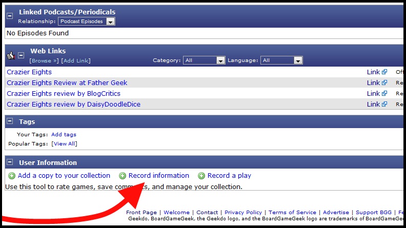 2. Go to the bottom of the game’s page on Board Game Geek and click on the record information link. (The Crazier Eights page is here.)