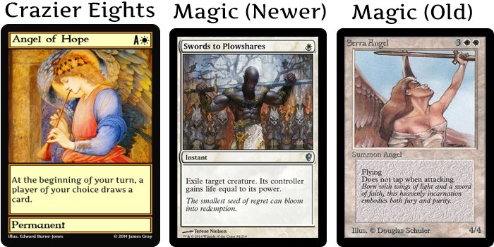 Although some people think that the Crazier Eights cards looks a lot like Magic: the Gathering, the card frame and layout are both different from Magic cards. Even so, it might be a good idea to change the look of the Crazier Eights cards to some extent. Continue reading